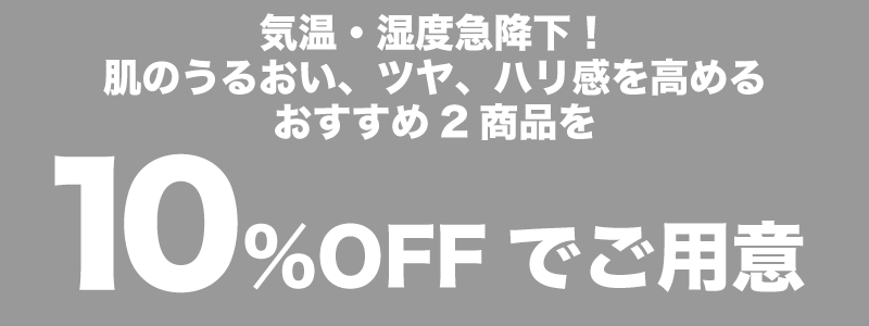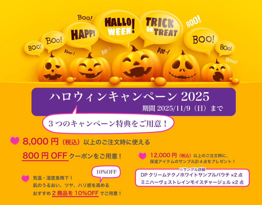 現在実施中のハロウィンキャンペーンでは、おトクなクーポンや保湿サンプルプレゼント(12,000円以上のご注文に限り)をご用意。さらにこの季節おすすめの保湿2商品を10%OFFでご用意しております。